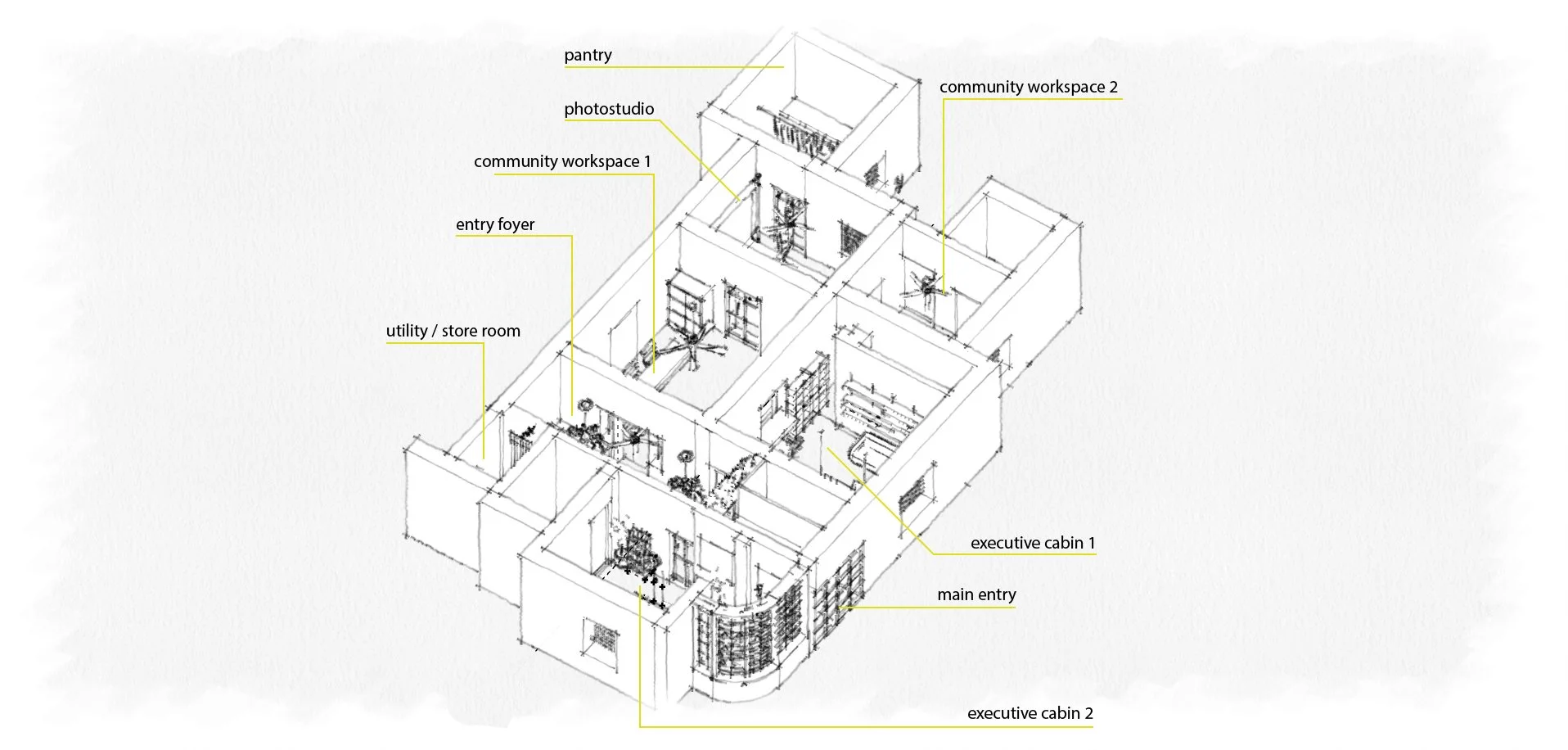 The layout was developed through targeted internal reconfiguration rather than extensive structural removal. Enclosed cabins and studio-support spaces were inserted where structurally viable, while larger original rooms were adapted into collaborative work areas and leadership cabins. The in-house photography studio was accommodated within the deeper-volume zones of the plan, allowing controlled lighting and acoustic treatment without disturbing the primary structure.