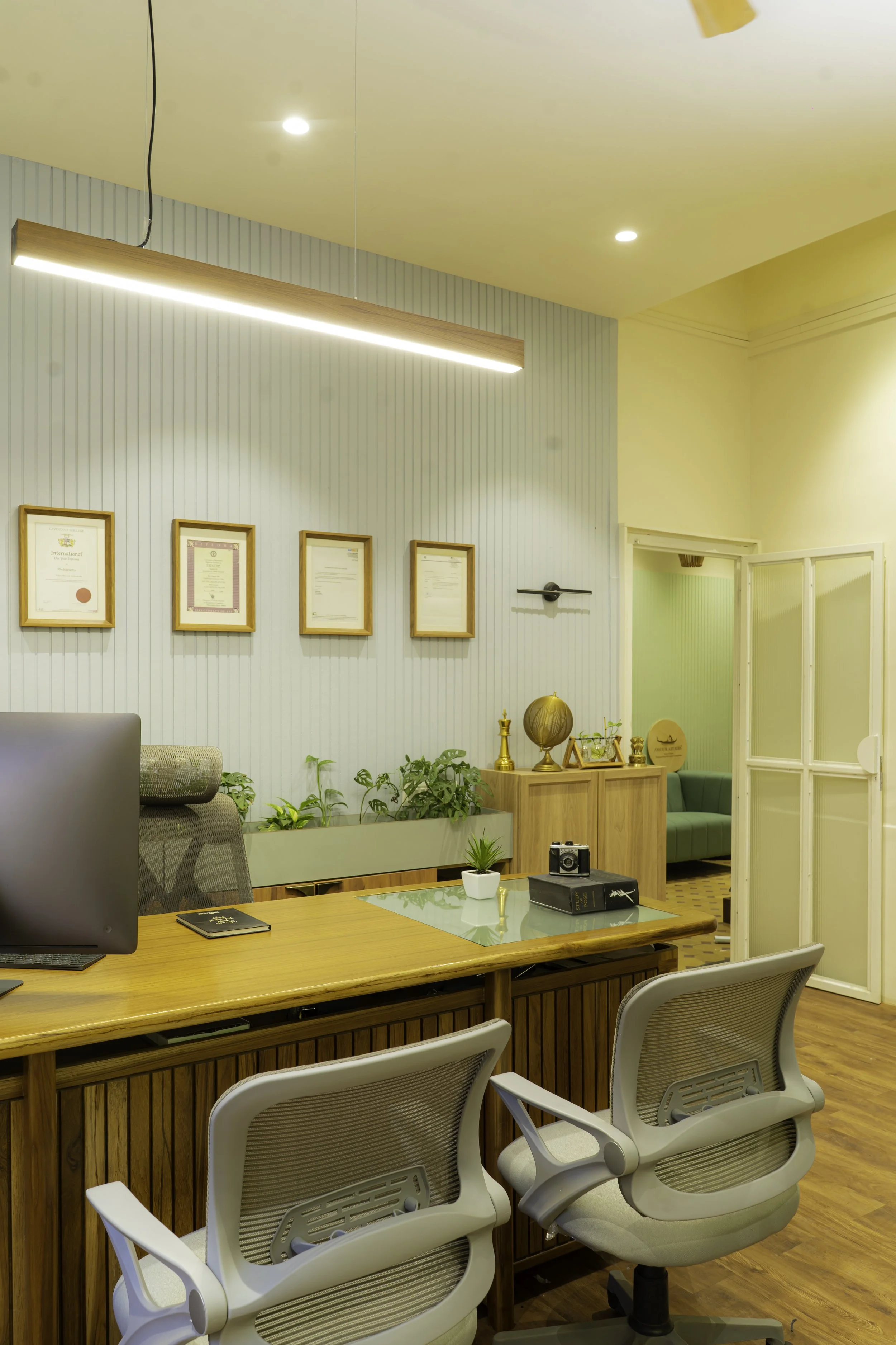 Set within a 1949 heritage bungalow in the heart of Pune, this 2,400 sq ft project reimagines a residential structure as a contemporary office for a creative agency with an in-house photography studio. The design approach focused on adaptive reuse — retaining as much of the original architectural character as possible while carefully inserting modern work infrastructure.